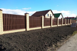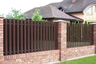 Заборы из металлического штакетника с кирпичными столбами в Королёве